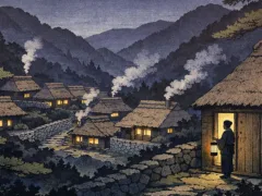 長距離トラック運転手が深夜の峠でエンジントラブルに見舞われた夜、山の斜面に灯りを見つけた。暦は昭和三十八年を示し、老婆は「夜明け前に出ないと外には戻れない」と言…