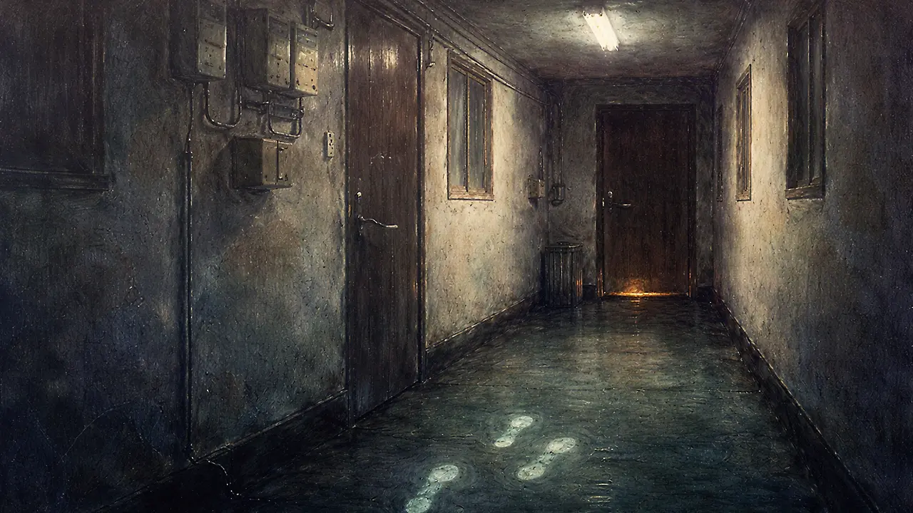 深夜一時を少し過ぎた頃、廊下を歩く足音が聞こえた。革靴のような、硬い音。コツ、コツ、コツと一定のリズムで、廊下の端のほうから近づいてくる。