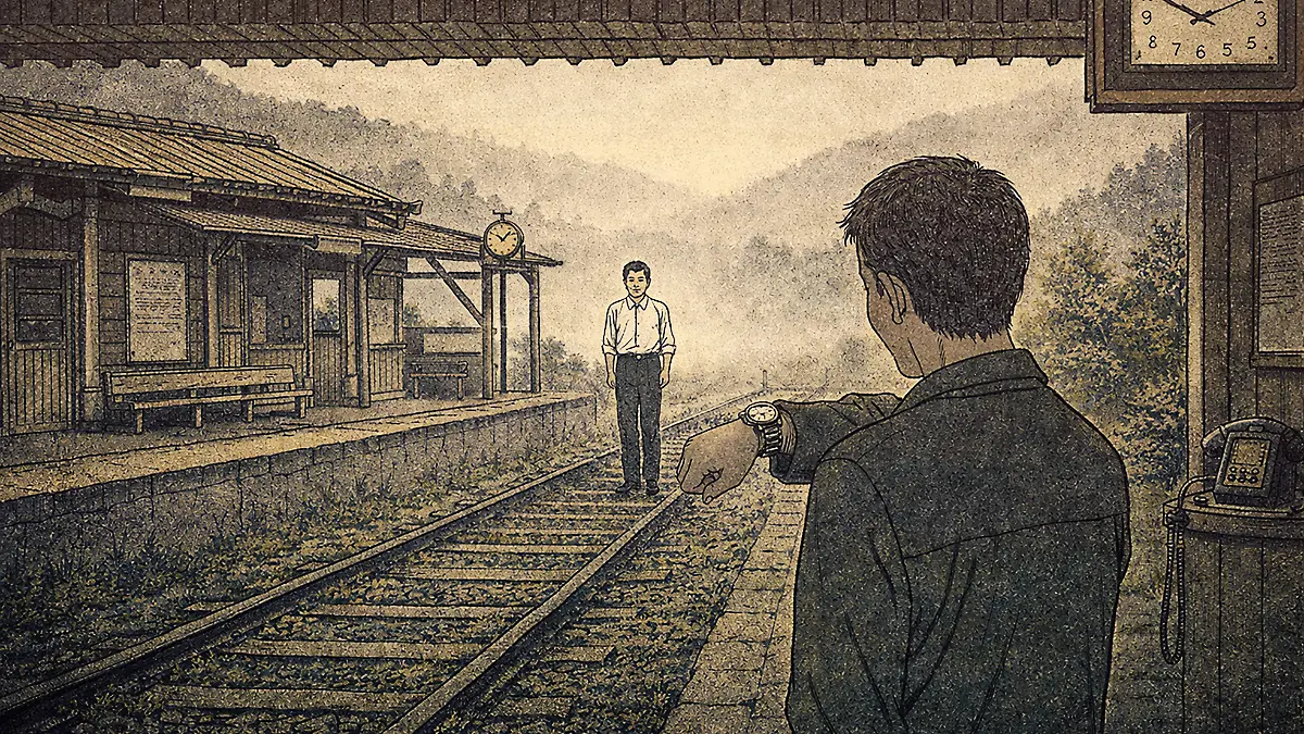 気がつくと、俺は線路の上に立っていた。駅舎は消えていた。あるのは草生した枕木だけだ。夕焼けが山の向こうに沈みかけていた。腕時計を見ると、15時47分。秒針が動いていない。