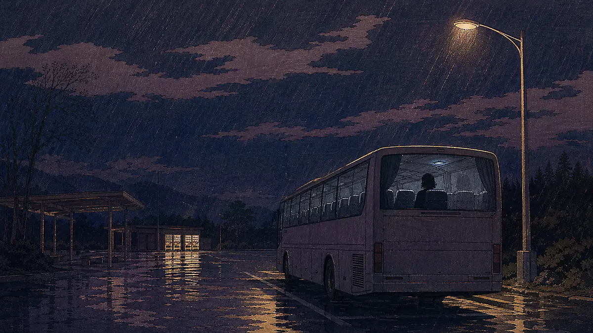 バスはちょうど雨が降り始めた二十二時三十分に出発した。